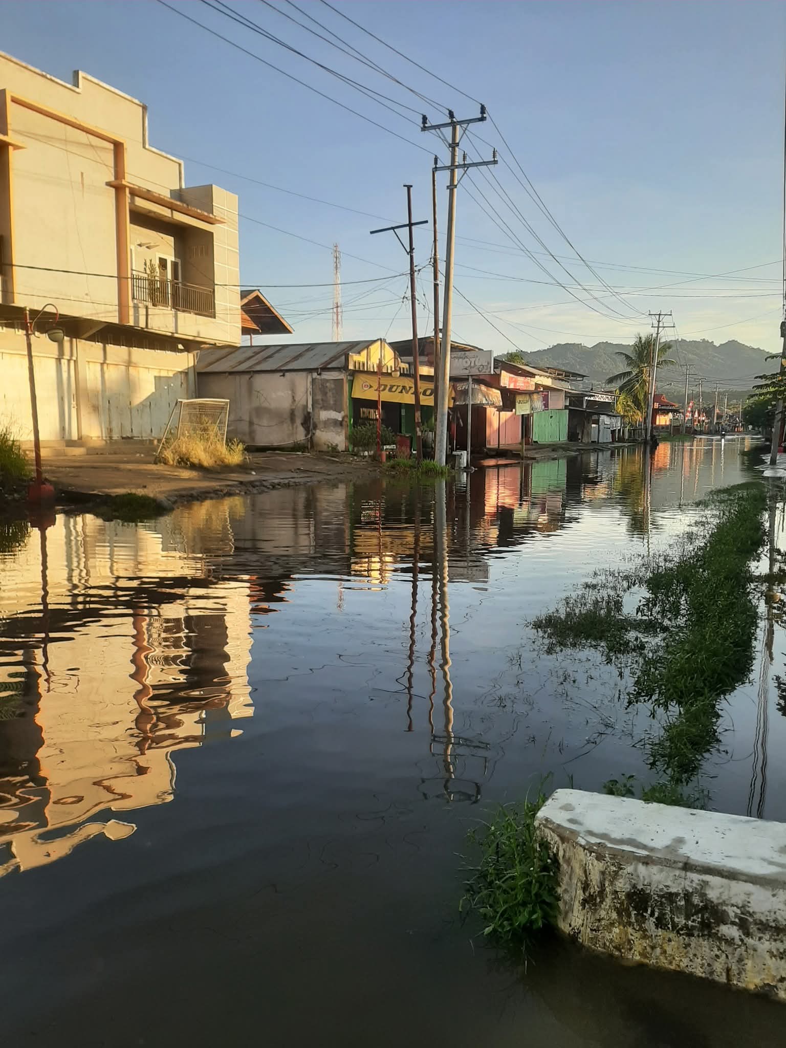 Xmakoranews.com//Ratatotok, Minahasa Tenggara — Hujan deras yang mengguyur sejak malam 14 Oktober kembali merendam jalan-jalan utama dan pemukiman di Desa Ratatotok. Genangan air cepat meluas, menenggelamkan trotoar, menutup akses warga, dan memantulkan bayangan bangunan yang berdiri di tengah krisis. Meski pemerintah desa telah membersihkan saluran irigasi, banjir tetap datang. Kali ini, lebih cepat dan lebih dalam.